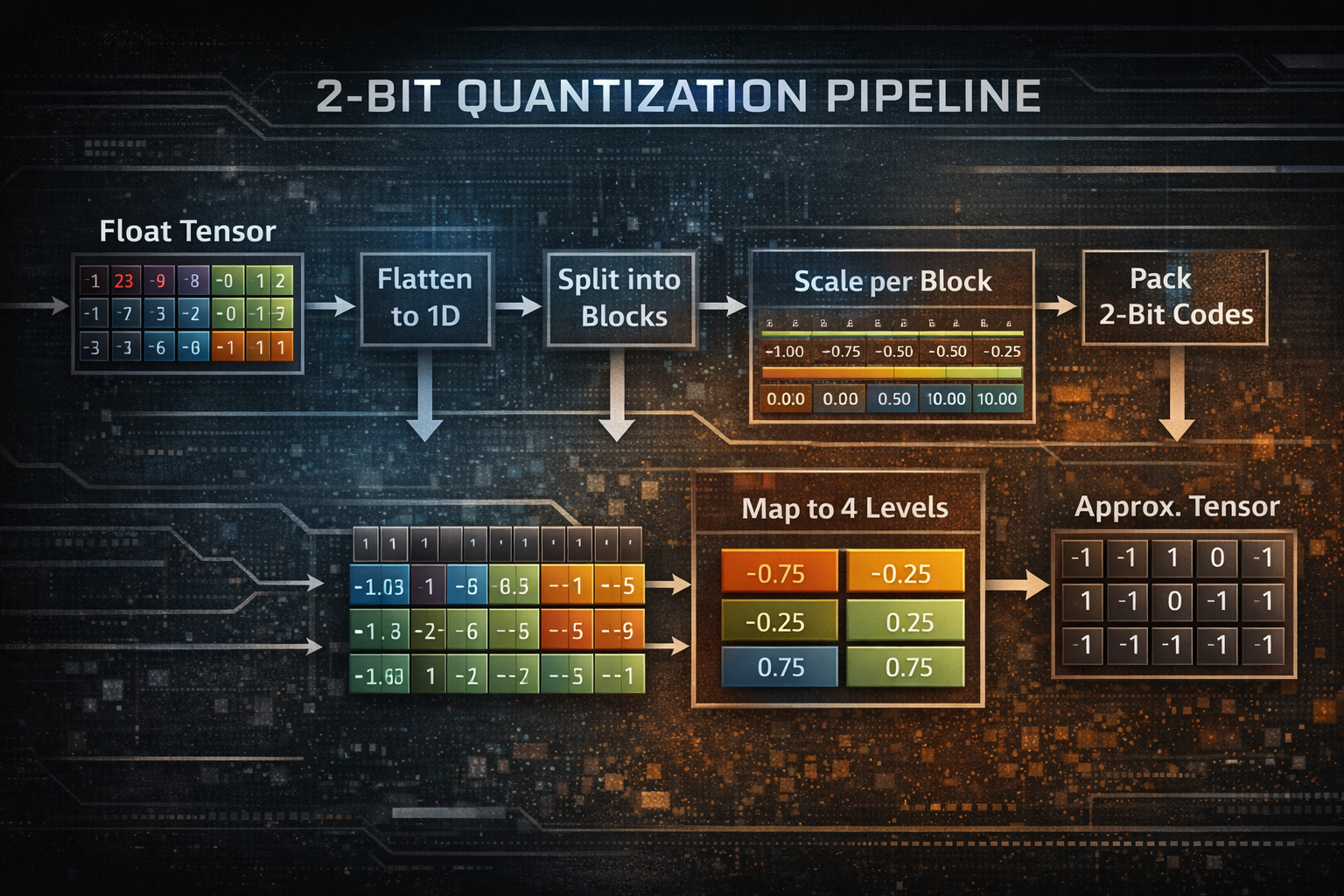 I did not begin with an advanced quantization library or a highly optimized compression pipeline. Instead, I built a deliberately simple blockwise 2-bit quantizer so I could understand every step of the process and inspect the behavior directly.