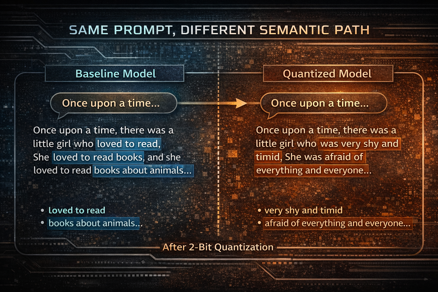 And that difference was not random noise. It had structure. The model could remain grammatical, locally coherent, and superficially plausible, while still being redirected into a noticeably different semantic trajectory. That is a much more interesting failure mode than simple collapse, because it suggests that aggressive quantization can preserve surface fluency while changing the deeper behavioral character of the model.