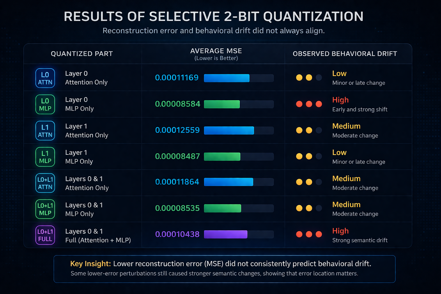 To explore that, I built a basic 2-bit quantization pipeline, applied it to a real open-weight model, and examined how the model’s behavior changed as different components of the network were perturbed.