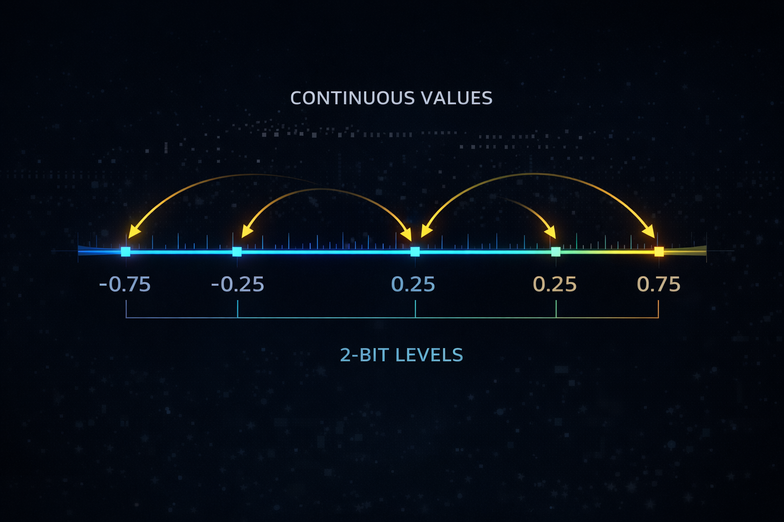 In this context, the quantization levels are the small set of values each normalized weight is allowed to snap to. Since 2-bit quantization only provides four possible states, every value in a block must be approximated using one of just four reconstruction values. You can think of these levels as the four buckets available to represent the continuous range of normalized weights.
