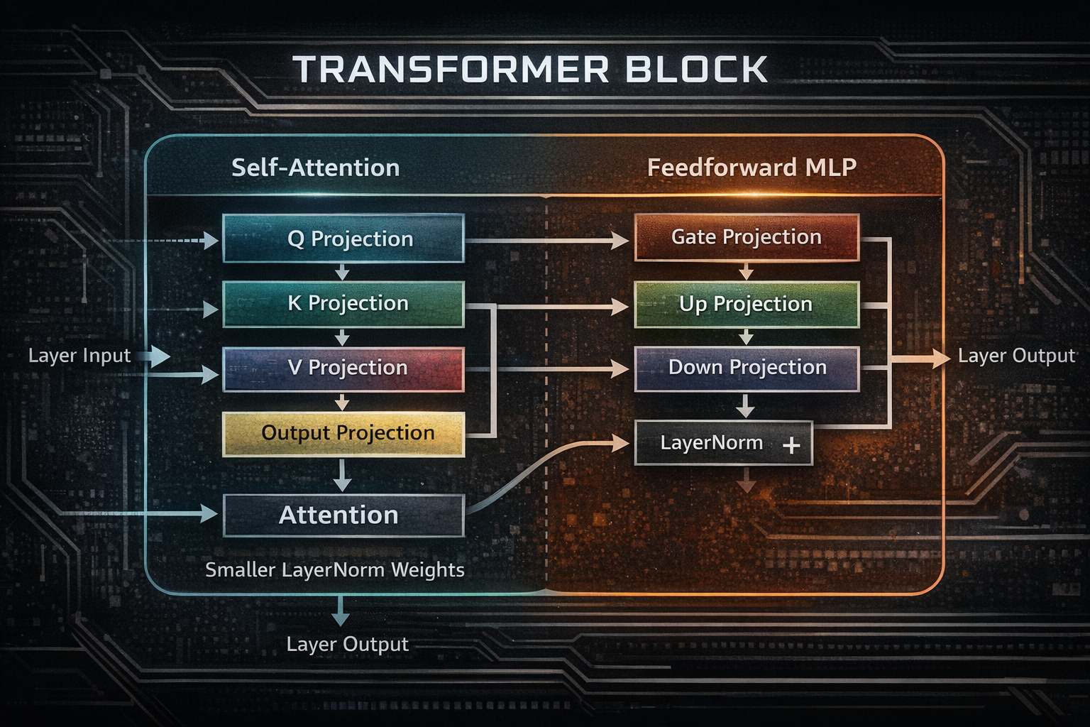 These handle the per-token transformation work that happens after attention. In simplified terms, up_proj expands the representation into a larger intermediate space, gate_proj helps control which features are emphasized, and down_proj compresses the result back into the model’s normal hidden size.