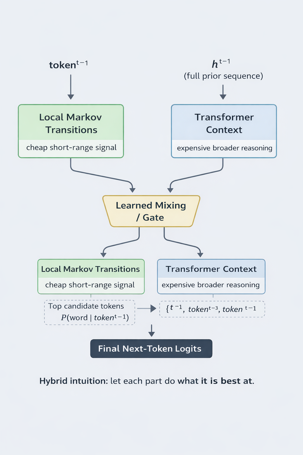 Local token transition structure is not enough to solve language modeling on its own, but it is also not meaningless. There are many places where short-range statistical regularities still matter. If some of that can be captured explicitly by a lightweight Markov-style component, then the transformer may be able to spend its limited capacity on broader contextual reasoning instead of relearning every local regularity the expensive way.
