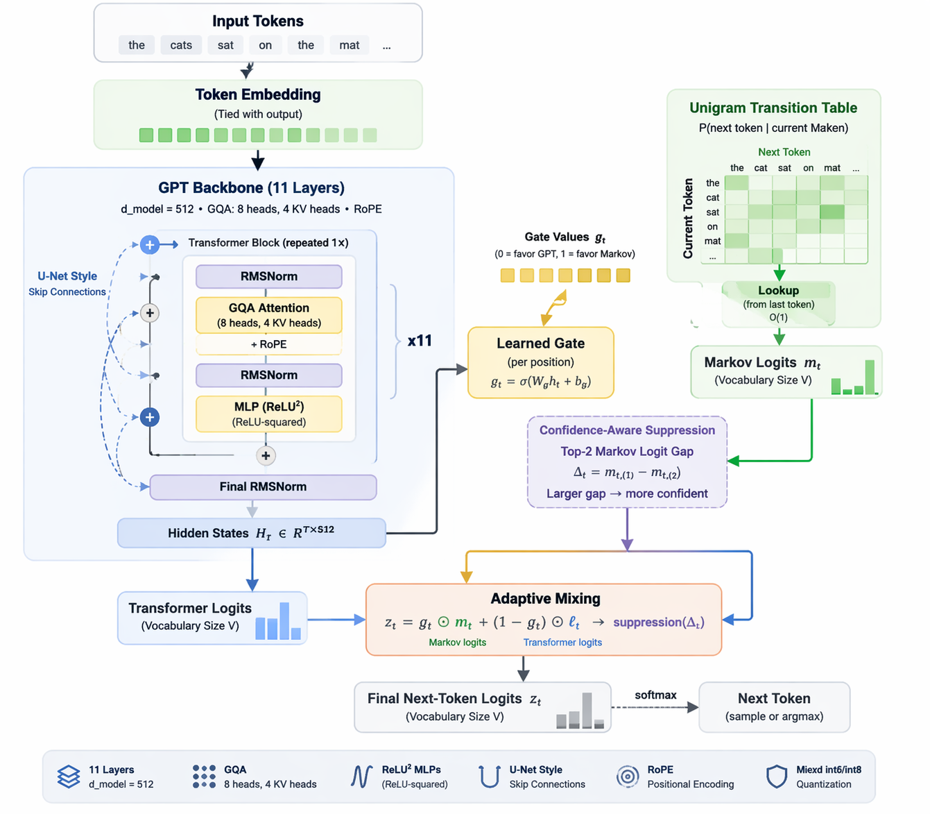 That became the working hypothesis: blend a causal GPT with an explicit Markov component and make the combination size-efficient enough to survive the competition constraints.
